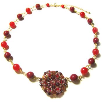 艶めく深紅と格調高い珊瑚緋、2色のラウンドボールが70年代のレトロな雰囲気を纏った一点物ネックレス。繊細にして豪華なバラのモチーフが上質なスイート感を漂わせます。